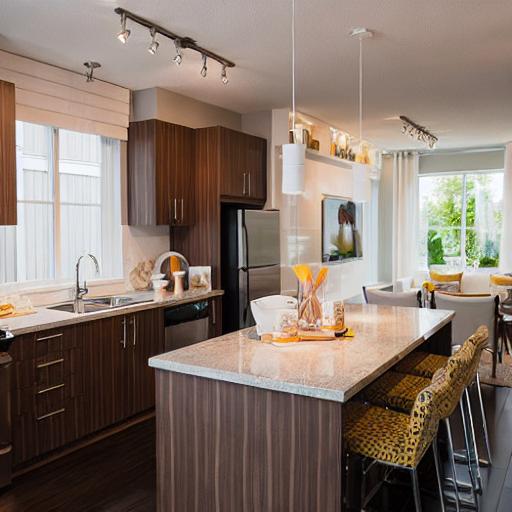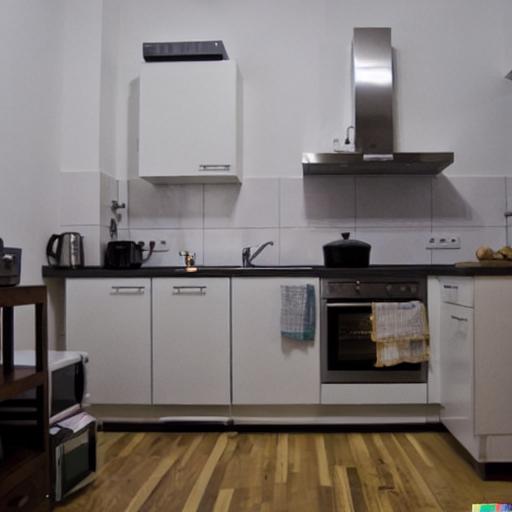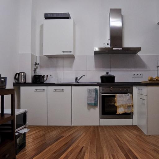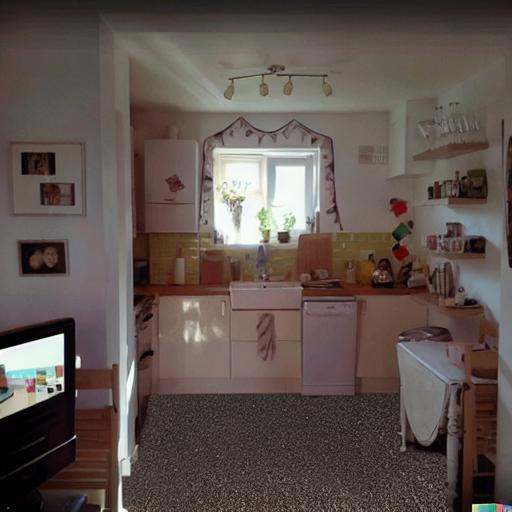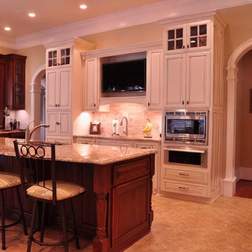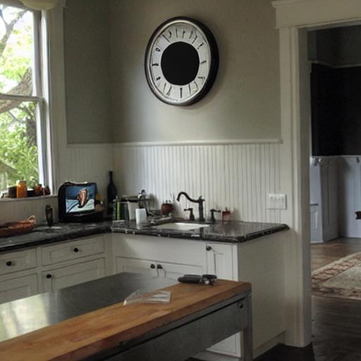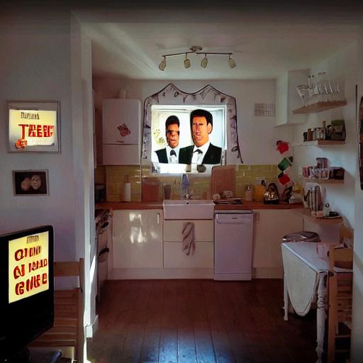 "source_global_caption": "A kitchen with a large TV mounted to its wall.",