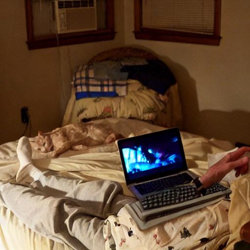 "target_global_caption": "A person typing on his laptop while laying in bed."