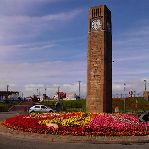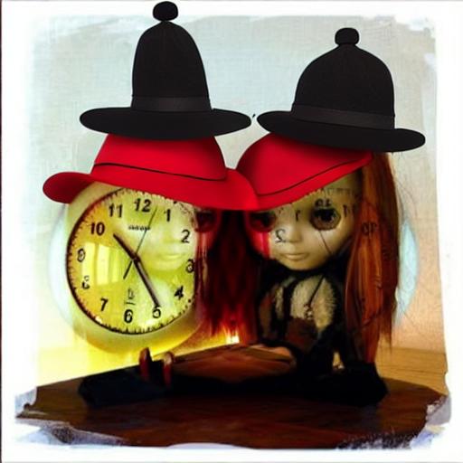 "target_global_caption": "A demonic looking chucky like doll wearing a hat standing next to a white clock."
