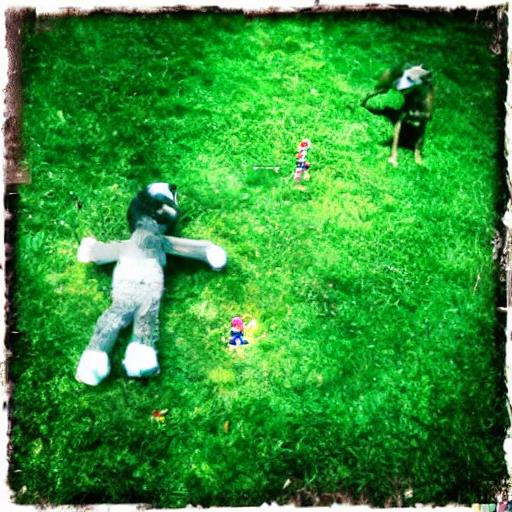 "target_global_caption": "A stuffed action figure toy laying down in the grass."