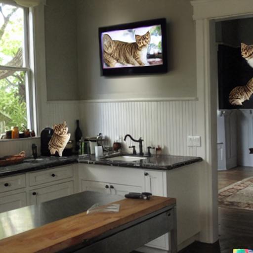 "target_global_caption": "A kitchen with a large TV mounted to its wall showing a show about cats."