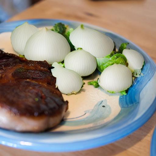 "source_global_caption": "Blue and white plate with meat and brussel sprouts.",
