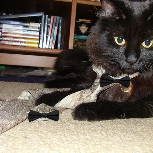 "source_global_caption": "A black cat in a bow tie laying on a carpet next to bookshelf.",