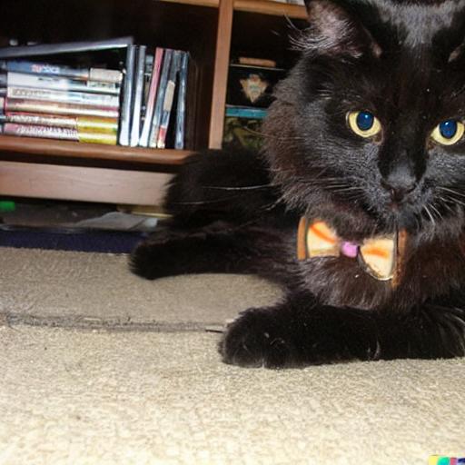 "source_global_caption": "A black cat with blue eyes in a bow tie laying on a carpet next to bookshelf.",