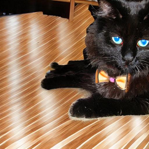 "target_global_caption": "A black cat with blue eyes in a bow tie laying on a wooden floor next to bookshelf."
