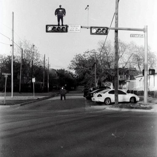 "target_global_caption": "A black and white picture of a policeman directing traffic at an intersection."