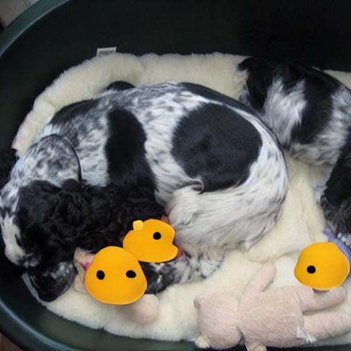 "target_global_caption": "Two dogs sleeping on a small dog bed. The bed has many rubber duckies on it."
