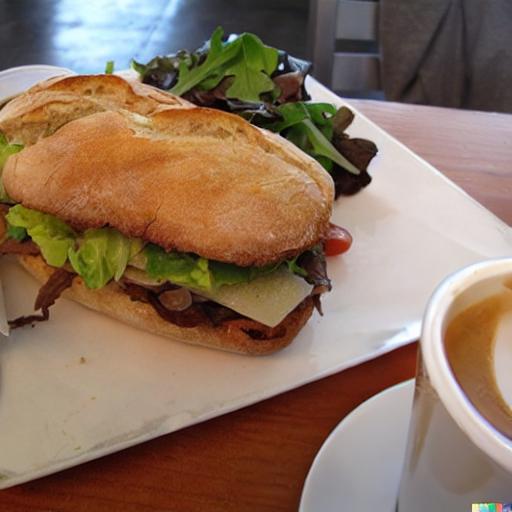 "source_global_caption": "A sandwich cut in half on a white plate with a side of salad, a cup of coffee, and a fork and knife wrapped in a napkin.",